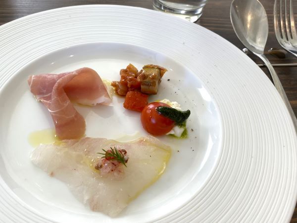 真っ白なお皿にピンクや赤が鮮やかな前菜は、マダイのカルパッチョ・生ハム・水牛モッツァレラのカプレーゼ・カポナータ。