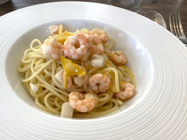 5種類のパスタから「芝海老と蕪と柚子のアーリオオーリオ」を選びました。