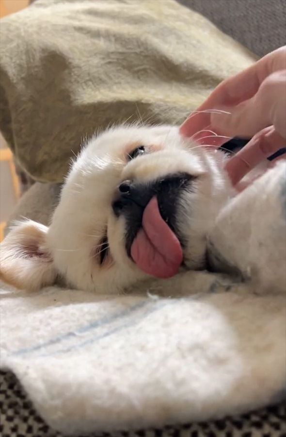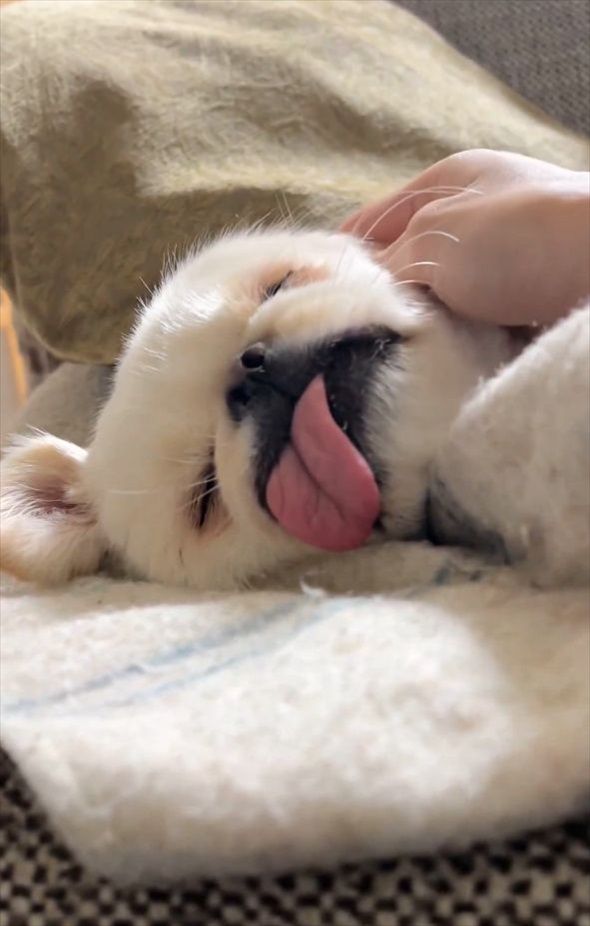 こちらは、ペキニーズの『ムーチョ』ちゃん。 飼い主さんに撫でられながら、気持ち良さそうに寝ています。