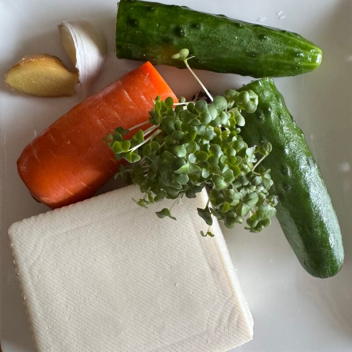 畑の肉といわれる豆腐は、骨や筋肉に必要な良質なたんぱく源です。カリウム豊富なきゅうりとは、相性がとても良い組み合わせ。むくみの解消や免疫力を高める効果も。食物繊維が豊富なにんじんやネギなどの野菜と一緒にいただくことで、血中コレステロールを下げ、肥満改善効果があるといわれています。ニンニクと生姜を使ったタレで温活効果も期待できます。