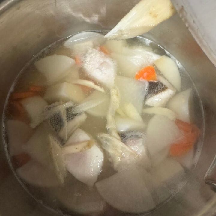 ④ 大根とにんじんは皮を剥き、銀杏切りに、たらは一口大に切り鍋に加える。