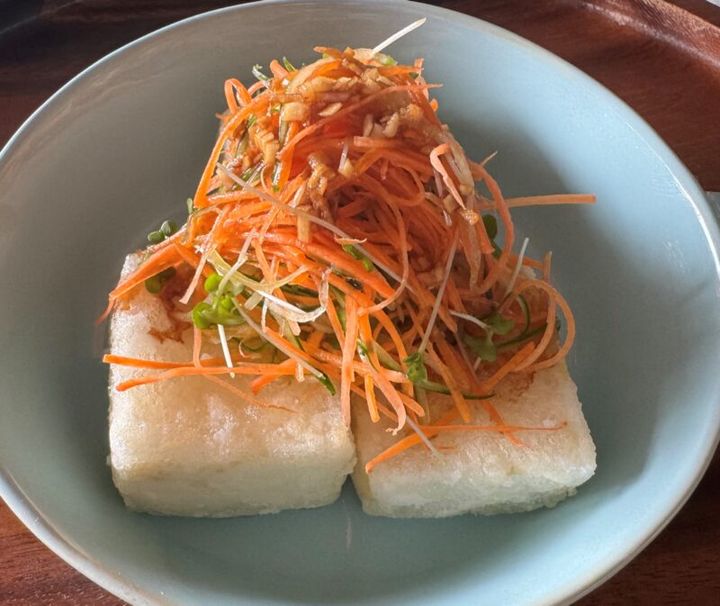 ⑦ 揚がった豆腐を皿に盛り付け、②の野菜を豆腐の上にたっぷりのせる。