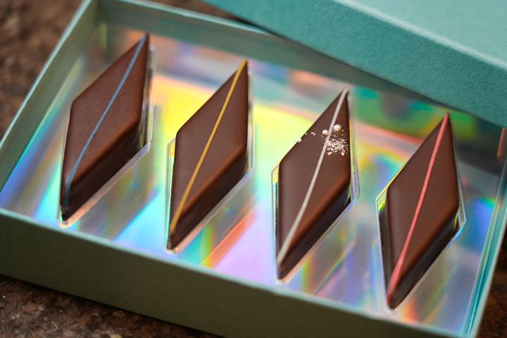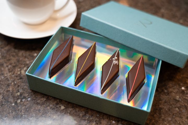 特徴的なひし形は、カカオを信仰するコスタリカの部族にとって「循環」を象徴するシンボルマークをモチーフにしているそう。パッケージは、バレンタインを起点にブルーとホログラムを基調としたデザインにリニューアルしており、箱を開けた瞬間思わず釘付けになってしまう美しさです...!