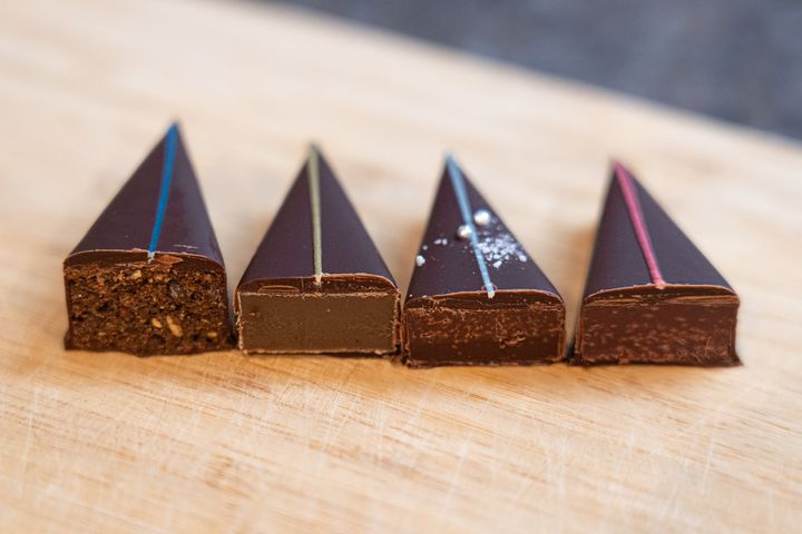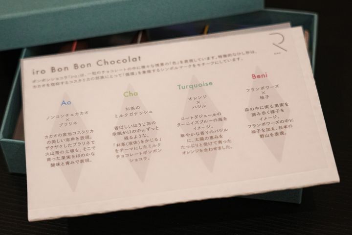 フレーバーは、左からノンコンチェカカオ×プラリネ「Ao」、お茶のミルクガナッシュ「Cha」、オレンジ×バジル「Turquoise」、フランボワーズ×柚子「Beni」。