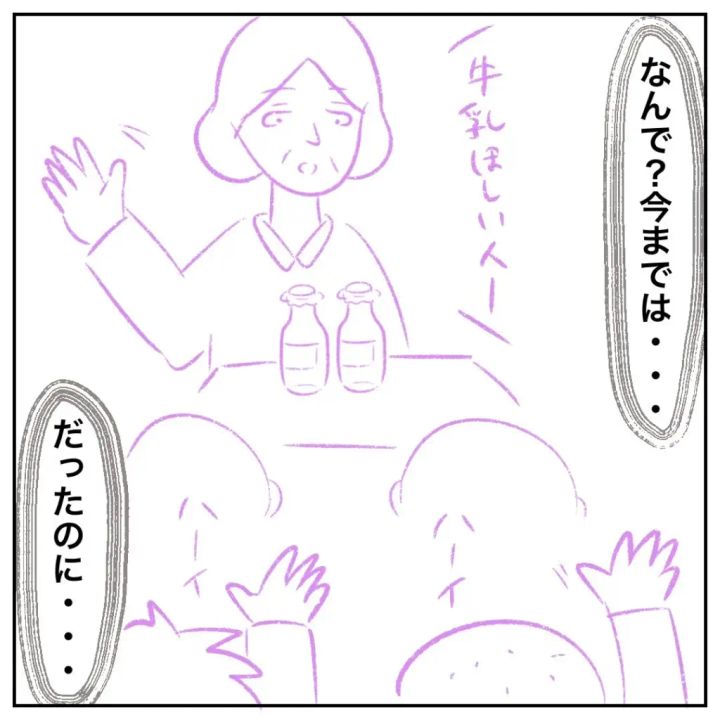 「なんで?今までは・・『牛乳ほしい人ー?」だったのに・・」と心の中で考えるまるさん。