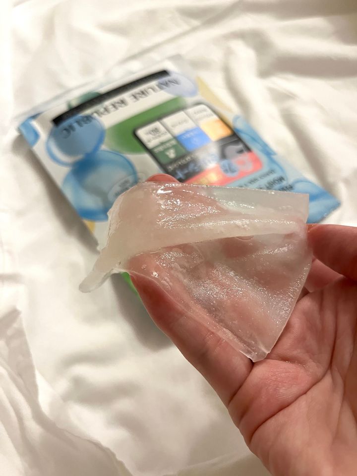 まず驚いたのがシートの素材です。ゼリーのようなぷるぷるとした感触で、顔にのせるとひんやりして心地よい冷たさが広がります。
