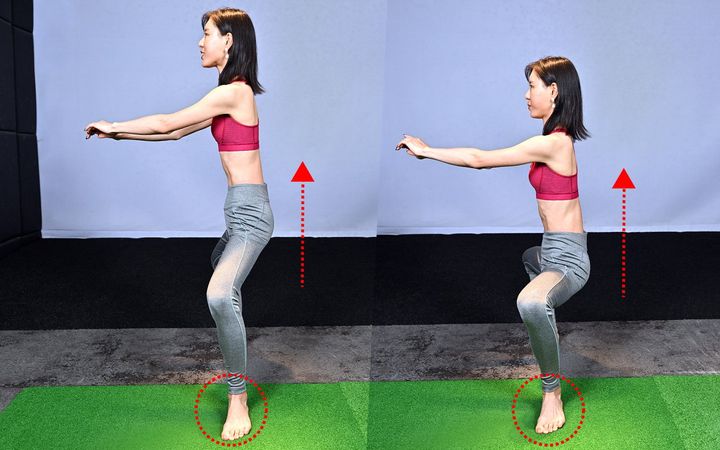 通常のスクワットだと、腰を落としたときにツマ先寄りに体重が乗るため、骨盤が前傾して負荷が小さくなります。このスクワットではツマ先に体重が乗らない分、骨盤も立ったままなので、負荷がきつくなります。それだけ効果があると感じてください。内転筋が鍛えられると、インパクトが強くなるので飛距離が伸びます。