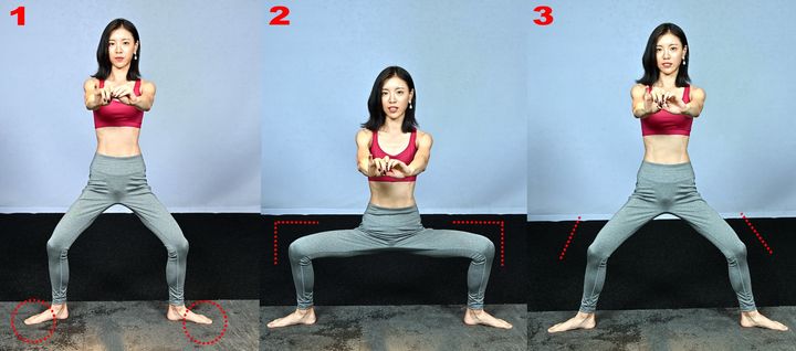1.まず、直立した姿勢から足を大きく広げます。このとき、両足のツマ先も開きましょう。