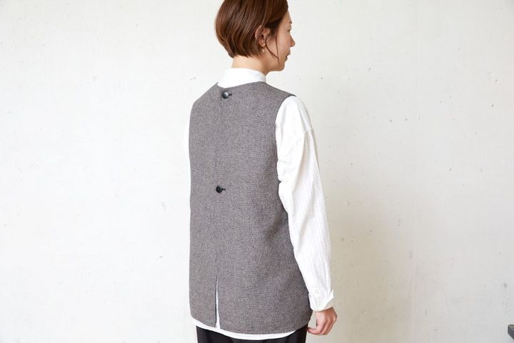 ベストとスタンドカラーシャツのクラシカルな合わせ技で、コートを脱いでも抜かりなし! ベストは、背面の大きなボタンがさりげないアクセントに。