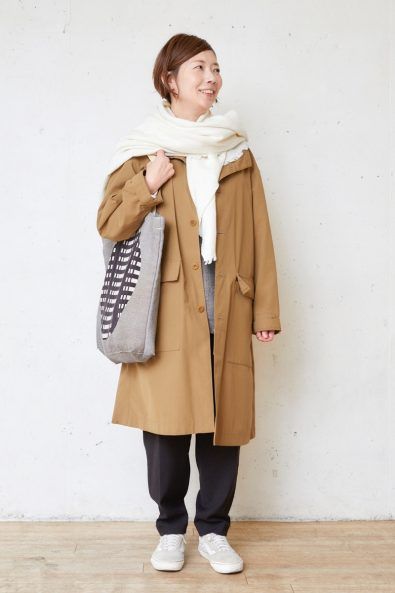 軽やかなコートをラフにはおり、白ストールを主役にしたシンプル&カジュアルな着こなし。