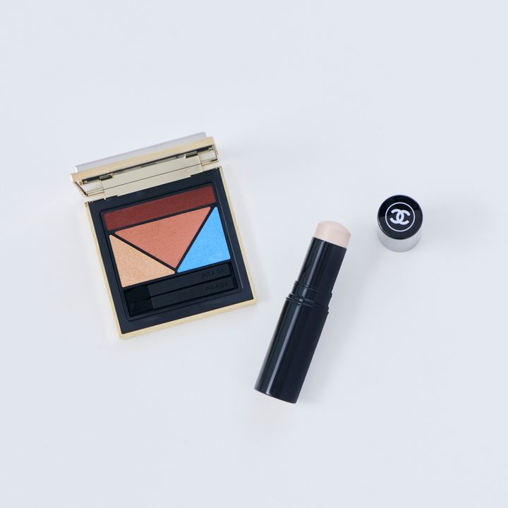 右から:ボーム エサンシエル スカルプティング ¥7,040(シャネル カスタマーケア TEL:0120-525-519)、ダイメンションズ マルチエフェクト アイシャドウ 05 ¥12,650(プラダ ビューティ TEL:03-6911-8440)