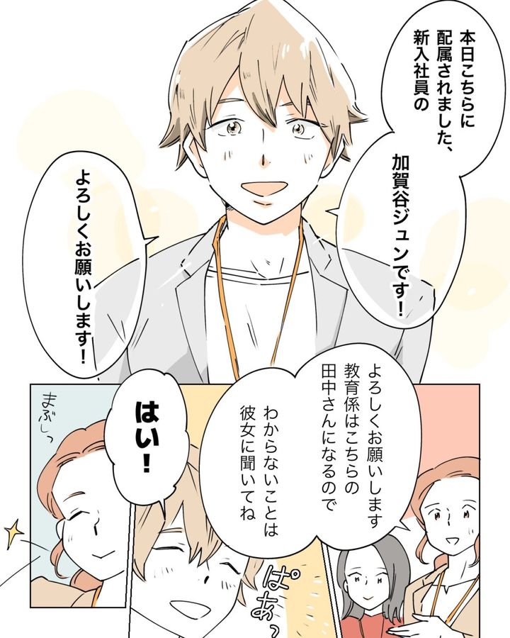 そんなある日、新入社員の加賀谷ジュンくんが配属されてきました。若くて爽やかなイケメン。教育係を田中さんにお願いして紹介すると、加賀谷の「はい!」という素直そうな笑顔が眩しかった。