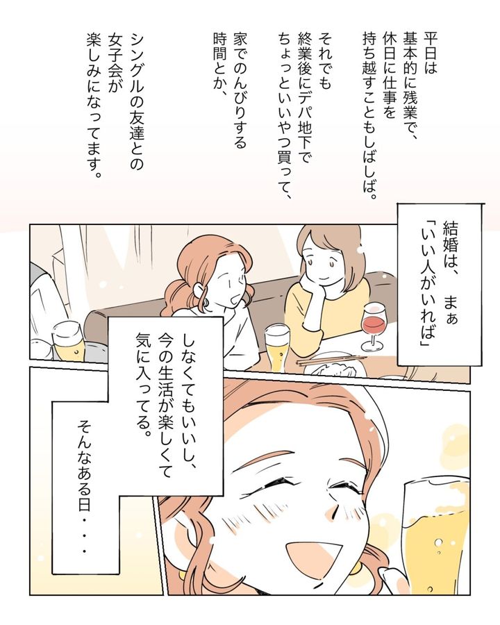 平日はいつも残業で、休日に仕事を持ち越すこともしばしば。それでも終業後にデパ地下のお惣菜を買って家でのんびりする時間や、シングルの友だち同士の女子会も楽しいから、今の生活が気に入っているんです。