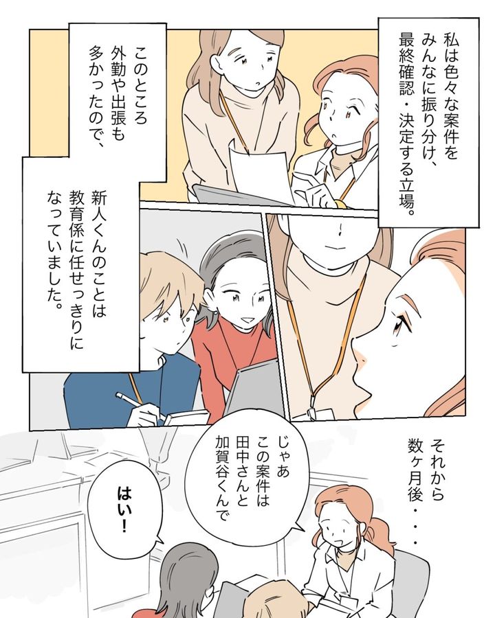 色々な案件をみんなに振り分け、最終確認・決定するのが私の仕事。このところは外勤や出張も多かったので、数ヶ月ほど新人の加賀谷君の事は田中さんに任せきりになっていました。
