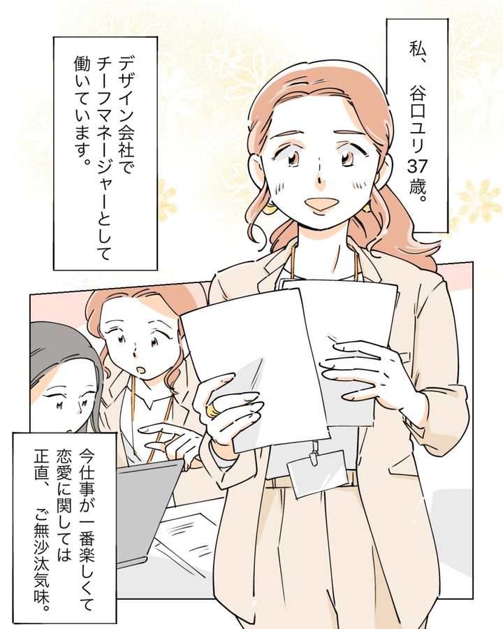 私は谷口ユリ。デザイン会社でチーフマネージャーとして働く37歳、独身。今は仕事が1番楽しいから、恋愛は後回し。