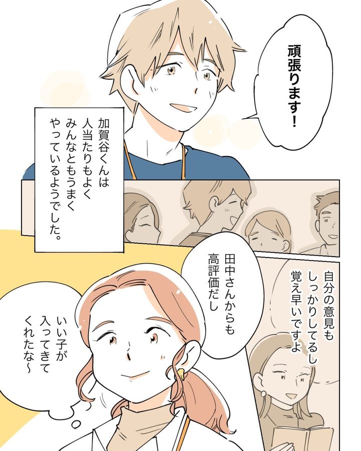 それでも私が見る限り、加賀谷君は人当りもよく、みんなともうまくやっているようでした。田中さんの評価も「自分の意見もしっかりしてるし、覚え早いですよ」と高評価。いい子が入ってきてくれたな~と喜んでいました。