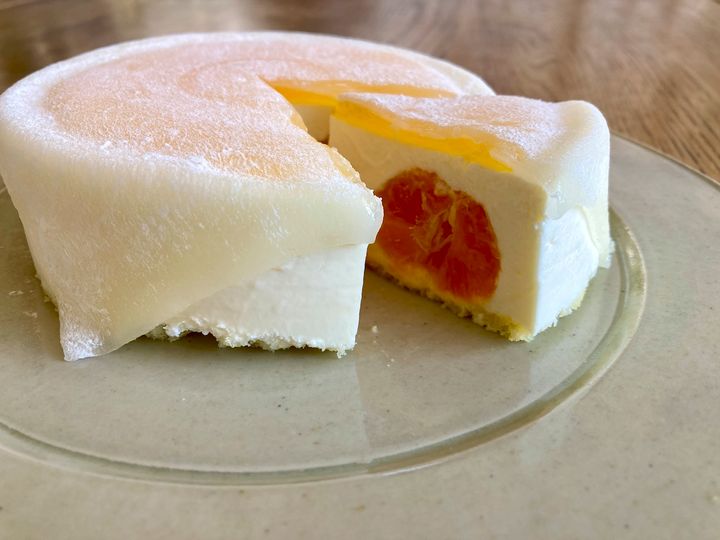 下から順に、スポンジ、まるごとみかんが入ったチーズムース、さわやかな甘みのみかん“せとか”を使ったソース、そしてぎゅうひが重なっています。