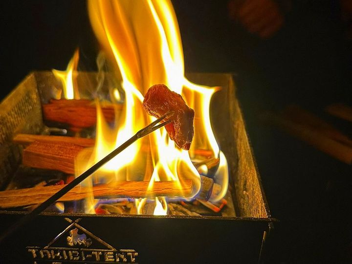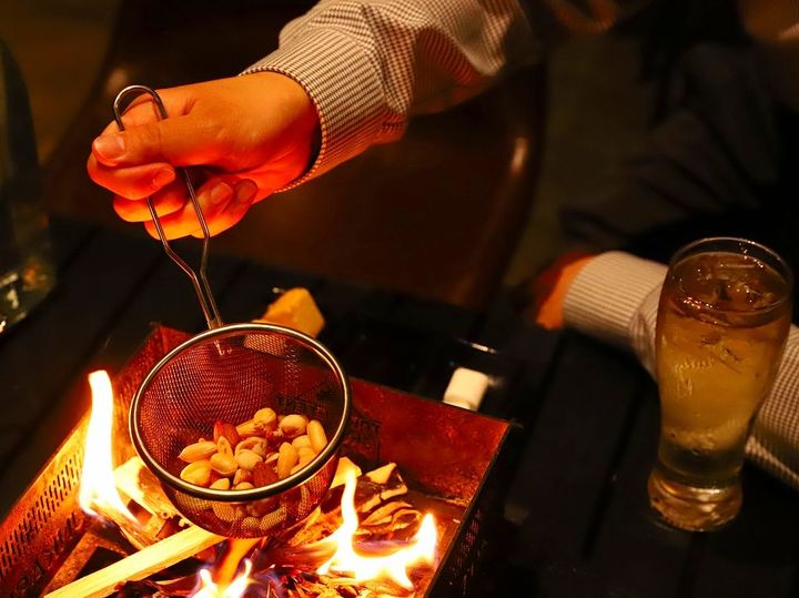 オサナイはずっと炎を見つめていたい派なので、ひたすら薪をくべてもらっておりました## 焚火だからこそ楽しめるフードメニューも充実