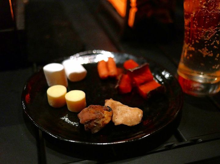 こちらは、鴨肉やチーズ、マシュマロなどが盛り合わせになっている“焚き火フォンデュプレート(1000円)”