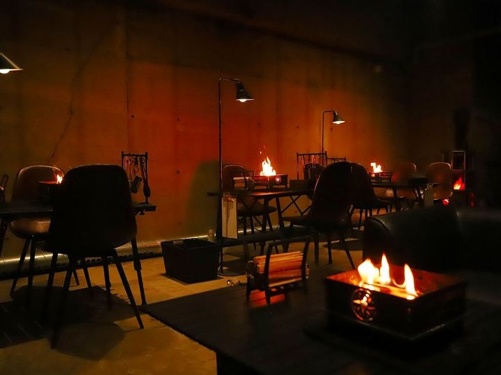 壁はコンクリート、店内は密閉状態、そして特殊な空調システムのおかげで室内でも焚き火が出来るようになっているのです(皆様のご自宅では、決してやらないでくださいね!)