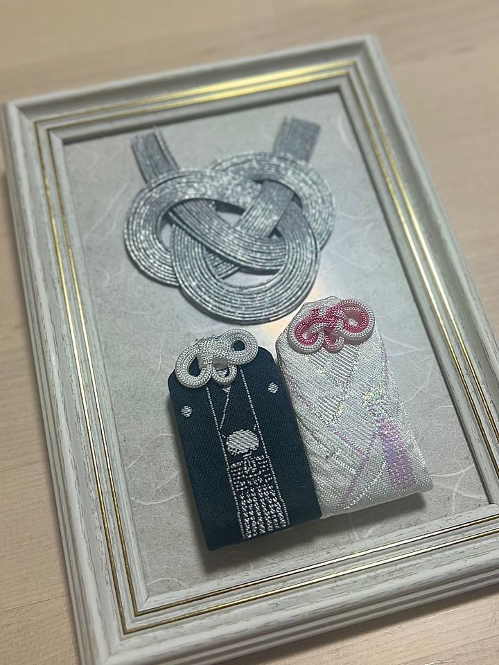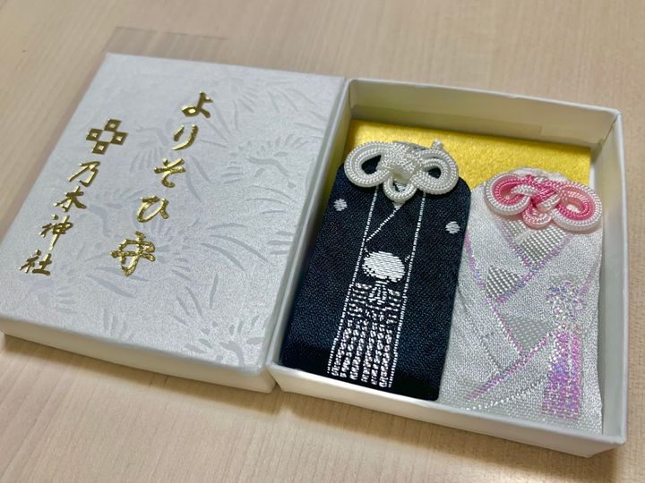 新郎の紋服、新婦の白無垢をあしらい、夫婦となる2人が末永くよりそっていただくようにと願いを込めた御守です。
