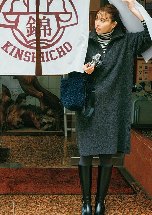 ボーダータートル¥4,389/ロペピクニック(ジュン) ニットワンピース¥4,990/UNIQLO ボアバッグ¥12,100/スリードッツ(スリードッツ表参道店) ロングブーツ¥39,600/ダイアナ(ダイアナ 銀座本店) ロングイヤリング¥1,650/RANDA Z fc 16-50 VR レンズキット¥150,700(プレミアムエクステリア:オリーブグリーン※張替有料サービス)/Nikon