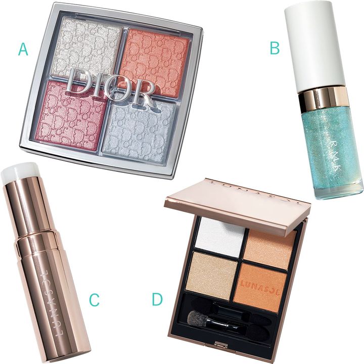 A:繊細な煌めきと透明感をプラスするパールホワイト、コーラル、ローズ、アイスブルーがセットされたマルチパレット。ディオール バックステージ フェイス グロウ パレット 006 ¥6,600 ※数量限定品(パルファン・クリスチャン・ディオール)Bグリーンやイエローのパールが角度によって表情を変えるグロス。手持ちのリップに重ねても◎。RMK リップ ルミナイザー 06 ¥3,520(RMK Division)C:頰やまぶた、唇にみずみずしいツヤを与えるクリアなスティックハイライト。ルナソル ラディアントスティックN 01 ¥4,950 ※1/24発売(カネボウ化粧品)D:光に包まれたベージュとアイスブルーが目元の透明感を際立たせる。ルナソル アイカラーレーションN 04 ¥7,700 ※1/24発売(カネボウ化粧品)