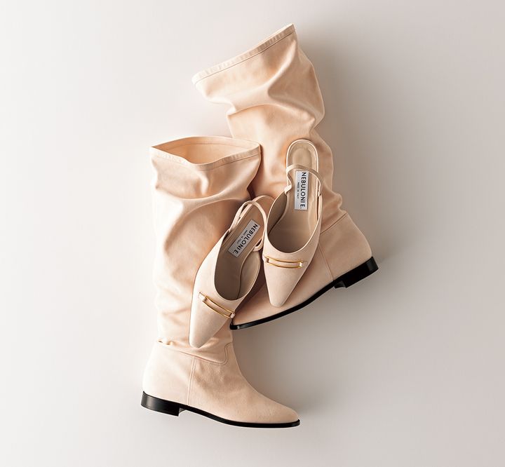 スエードで淡い色。タイツを合わせるなら断然グレーがオススメ。春先は白のソックスや、もちろん素肌にもなじみます。こうした汚れやすい靴は、おろしたて、履く前に防水スプレーをかけるべし。ミュールサンダル[H1.6㎝]¥59,400ブーツ[H2.5㎝]¥107,800(ともにネブローニ)