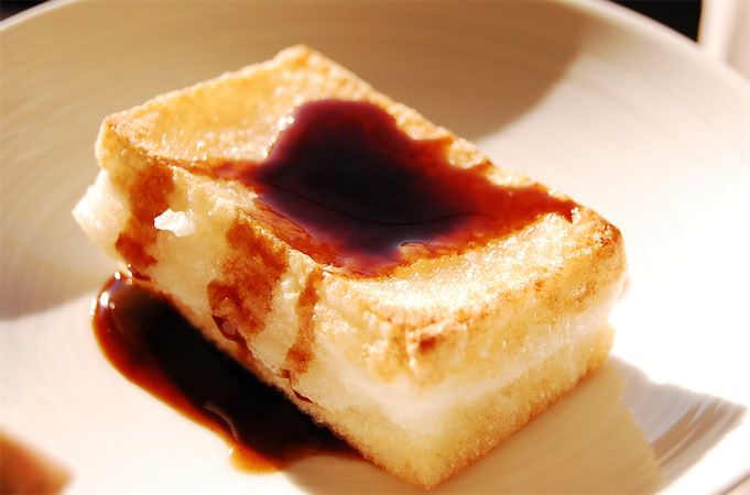 揚げ焼きにしたことで、お餅が香ばしさと油のコクをまとい、甘めのとろっとしたソースと非常によく合います。