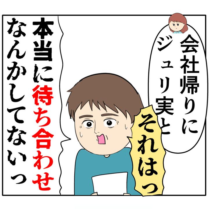 「会社帰りにジュリ実と・・」と言うめいさんの言葉を遮って「それはっ!本当に待ち合わせなんかしてないっ!」と必死に言うろみ緒さん。