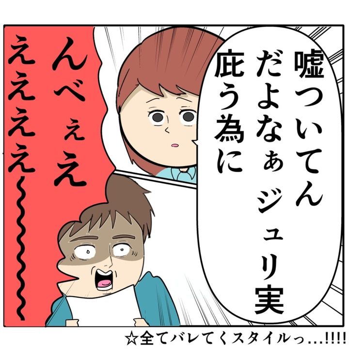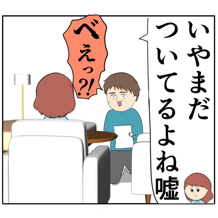 そんなろみ緒さんを見ても、「いや、まだついてるよね嘘」とろみ緒さんを全く信用していない様子のめいさん。ろみ緒さんは「べぇっ!?」とめいさんの言葉に驚きました。