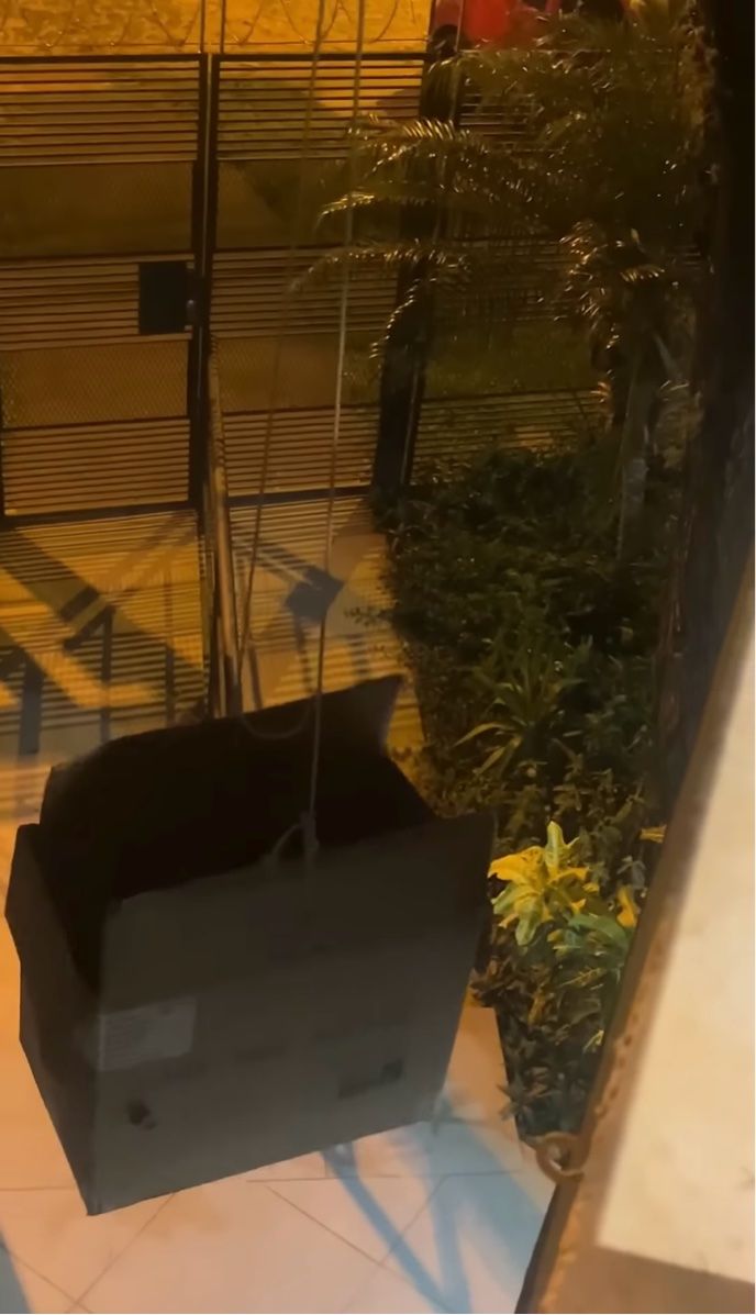 2階のベランダから地面に向かって紐でつるしたダンボールの箱を降ろす男性。 すると、その中にネコがひょいっと乗り込みました!