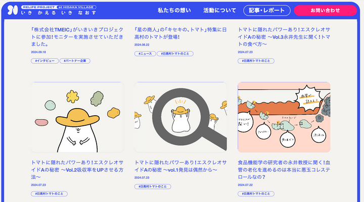 また、日高村で特産品のフルーツトマトと土佐八升豆を使用した健康食品のゼリーを開発していて、これはそのコラム記事の一部です。このゼリーは、トマトに含まれるGABAがストレス軽減に効果があり、豆も同様に心の健康に寄与するとされていて、地域から都会へ元気を届けることを目指している商品です。この商品を広めるために、トマトを研究している教授にインタビューをしてコラムを書いたり、HPのイラストを描いたりしています。