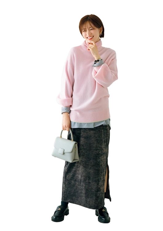 ベロアスカート/着回し タートルニット¥10,450/ミラ オーウェン ルミネ新宿2店 シャツ¥9,990/PLST ピアス¥3,960/ヘンカ(ロードス) 時計¥19,800/マトウ(エイチエムエスウォッチストア 表参道) 靴下¥990/靴下屋(タビオ) バッグ¥5,800/Olu. ローファー¥19,800/ダイアナ(ダイアナ 銀座本店)