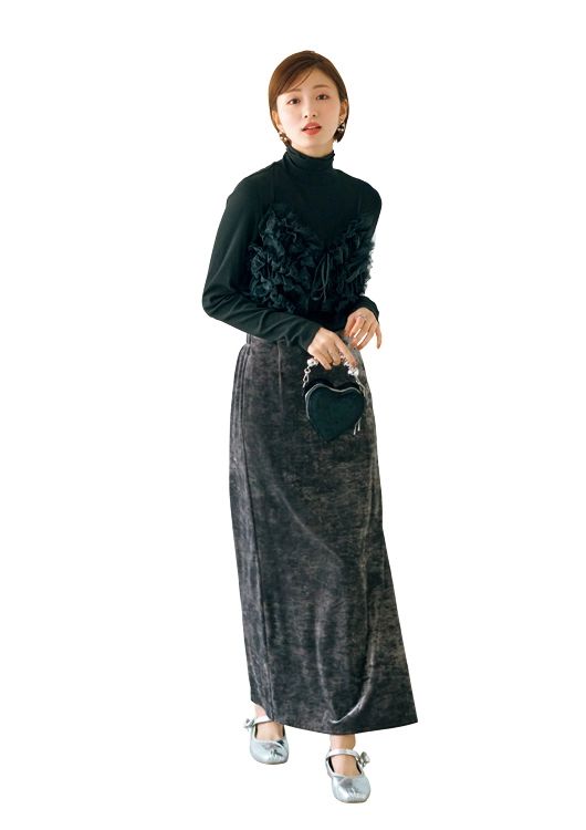 ベロアスカート/着回し チュールビスチェ¥5,500/ローリーズファーム(アダストリア) カットソー¥5,990/アンフィーロ(オンワード樫山) イヤリング¥8,580/イットアトリエ、リング[右手]¥15,400/オンブル ビジュー(ともにフォーティーン ショールーム) リング[左手]¥2,750/ヘンカ(ロードス) バッグ¥16,500、パンプス¥17,600/ともにCOEL