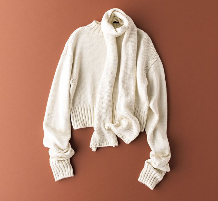 シルク100%の糸に微起毛加工を施し、光沢としなやかな肌触りを実現。ニット¥74,800ミニマフラー¥29,700(ともにアソース メレ/アイネックス)
