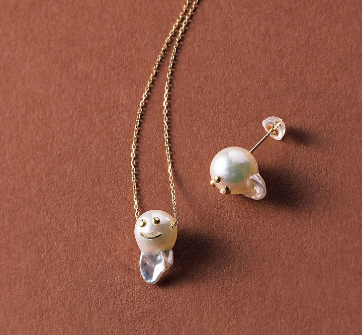 人気の「オバケちゃん」。〈右から〉シングルピアス〈YG×あこや真珠バロック〉¥49,500ネックレス〈YG×あこや真珠バロック〉¥88,000(ともにカドー/CADEAUX 六本木ヒルズ店)