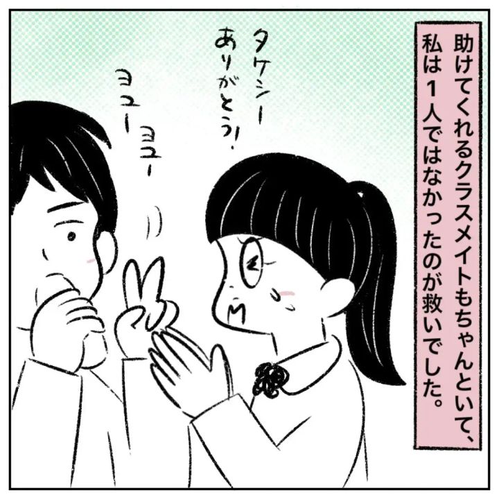 助けてくれるクラスメイトがいて、まるさんは「私は一人じゃない」そう思えることが救いなのでした。