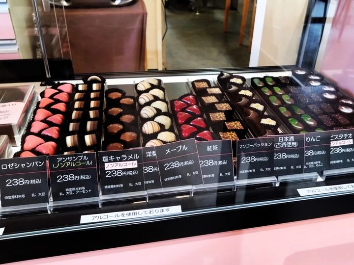 ショーケースにはとってもきれいなボンボンショコラが!基本的にはアルコールを使用していますが、中にはノンアルコールのものもあります。