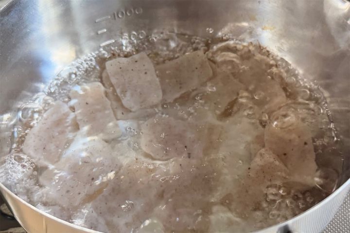 3. こんにゃくは5mm厚さの食べやすい大きさに切り、下茹でして水気を切ります。水から茹で始めて、一度沸いたタイミングで引き上げてください。