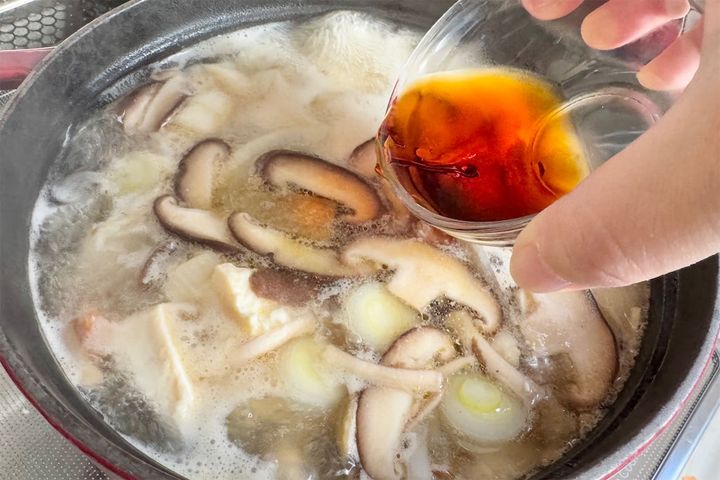 だし汁と調味料を加えてひと煮立ちしたら、弱火で10分煮ます。アクが気になる方はとってくださいね。