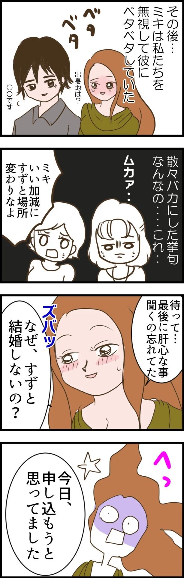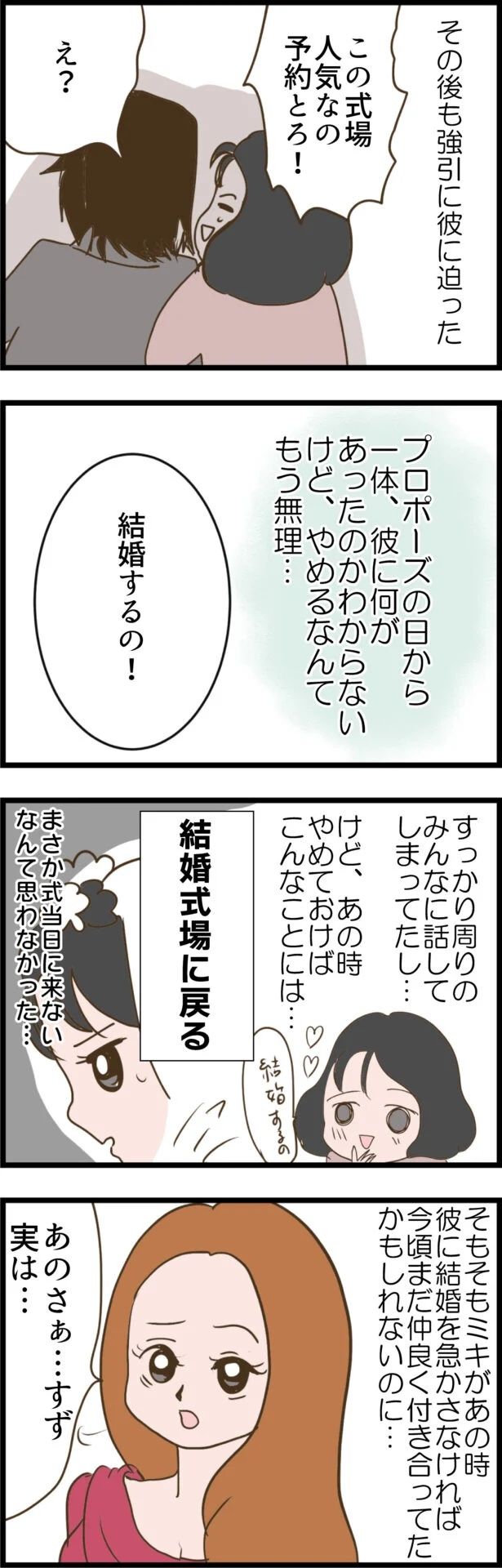 人妻にも関わらず、親友の彼にアプローチする非常識なミキの行動だったが、それによって彼からのプロポーズを聞くことになったすず。しかし、浮かれたのも束の間、その後あからさまに彼から連絡が来なくなったのです。