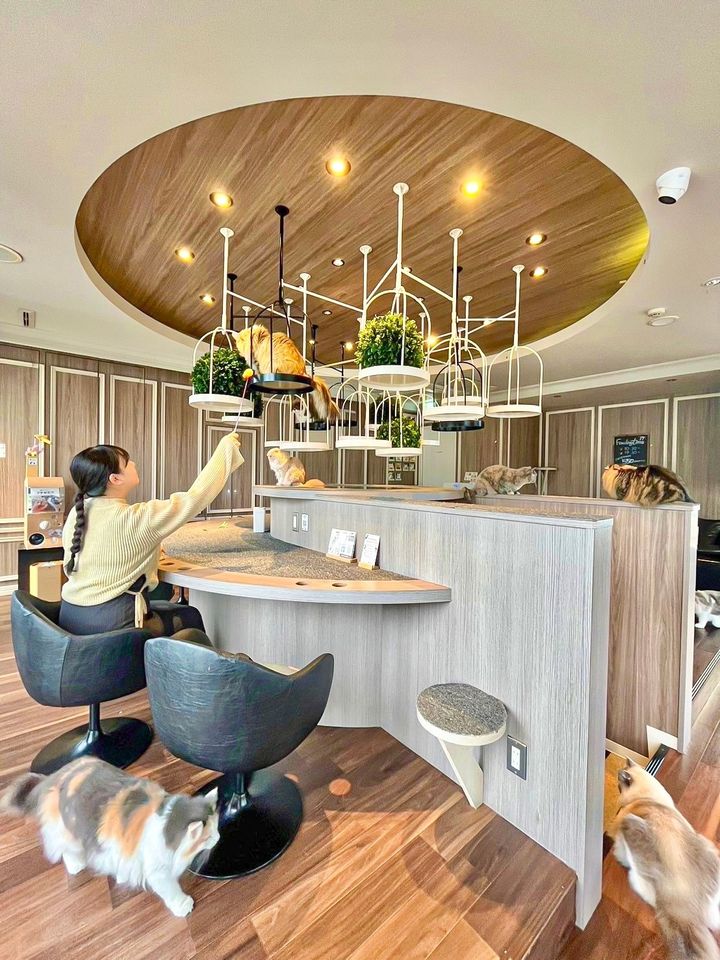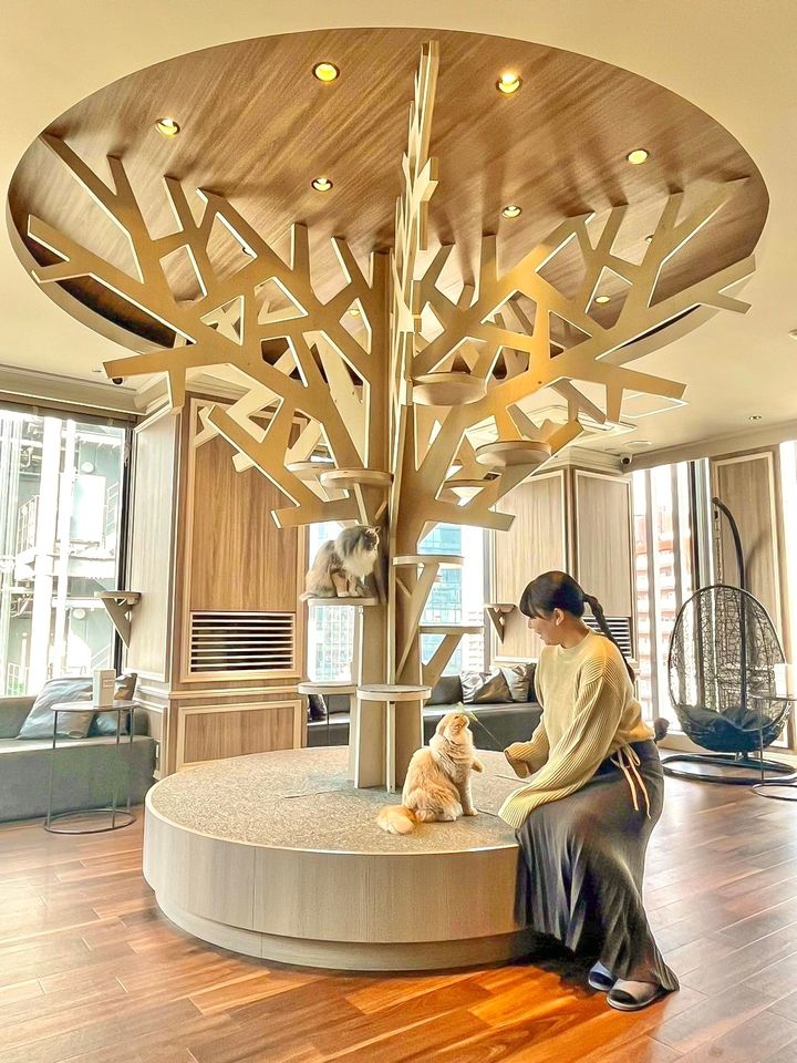 白い木のキャットタワーや天井から吊るされたカゴのようなネコスペースは、SNS映えするオシャレな内装🌳✨️