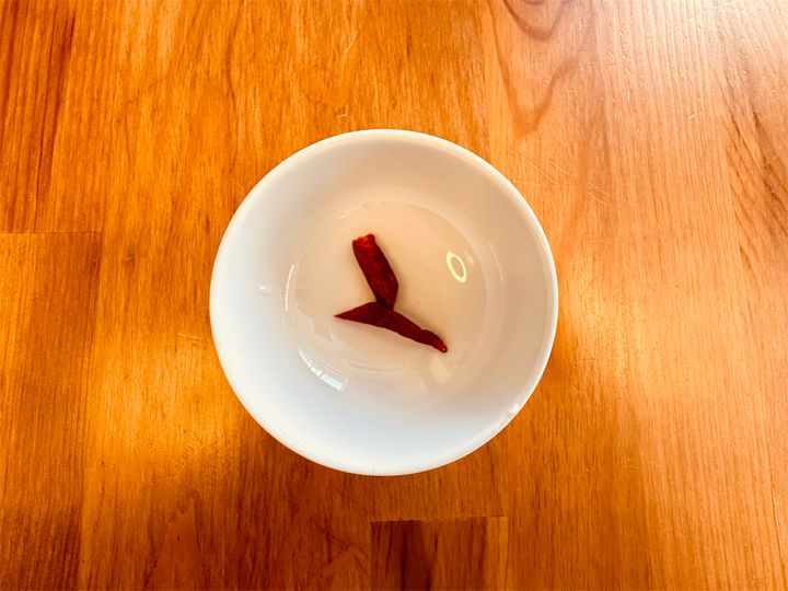 3. 鷹の爪は種を除き半分に切り、2に入れる。