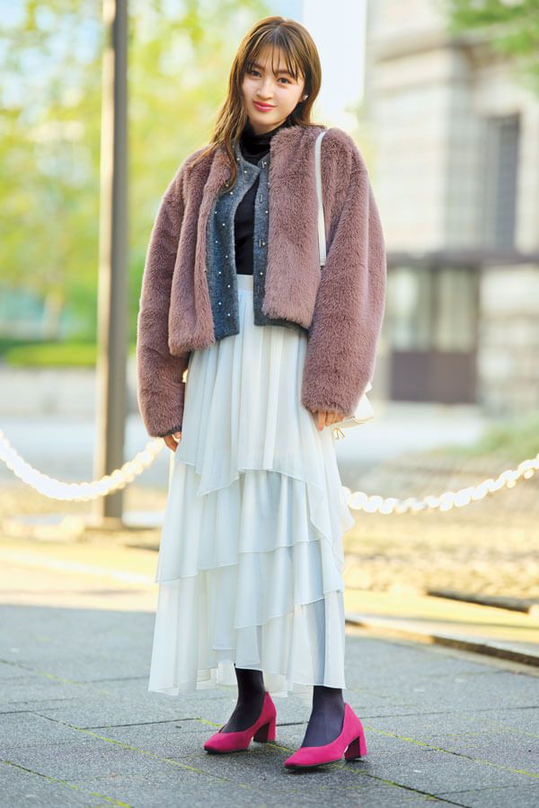 上半身が華奢なウェーブさんは、ノーカラーのコートをシンプルに着ると貧相に映ってしまうリスクが。首元を盛ったり、レイヤードで華やかさを出すことでフォローするのが似合わせのポイント。タートルネックとパールのきらめきで上重心に誘導をして、ボトムは落ち感あるティアードスカートですっきりと。