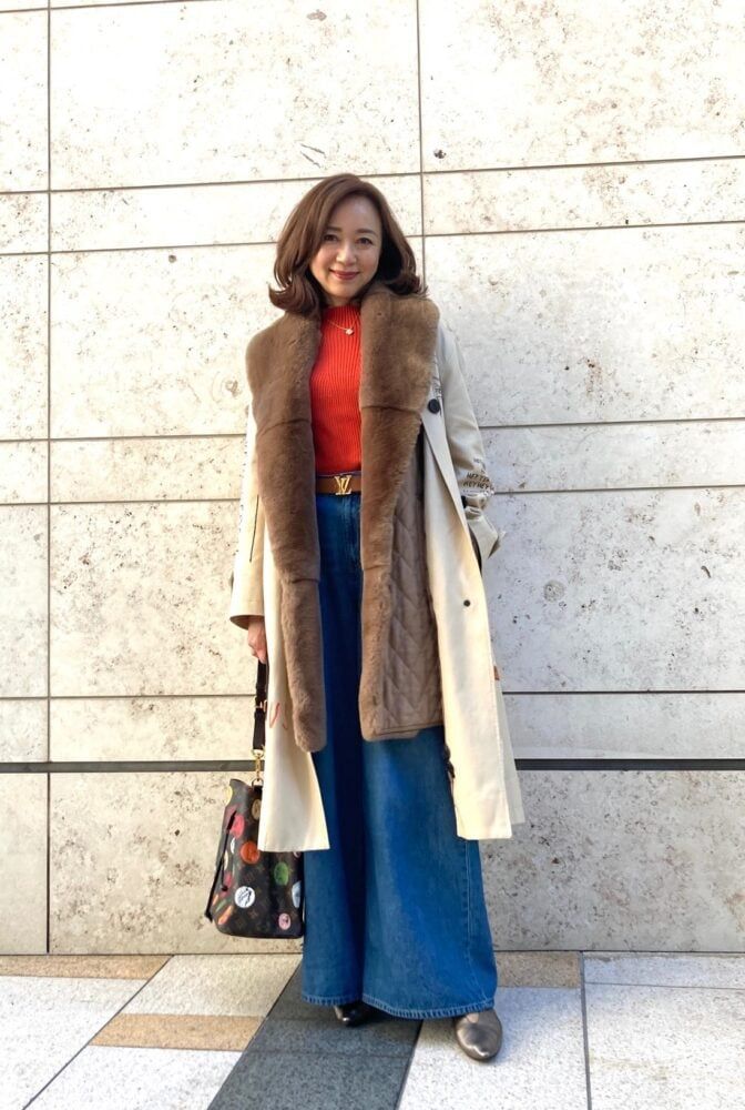 まだ寒い日が続きますが、そろそろ春を意識したファッションを楽しみたいという鈴木さん。「足元をブーツからパンプスに替えて軽やかに。コートも綿素材で春を意識したものにしました。ただ気温は低いので、襟元にファーがついたキルティングジレを重ねて、温かさと華やかさをプラスしています」。インナーのオレンジニットも、温かみのあるカラーでお気に入りなのだそう。