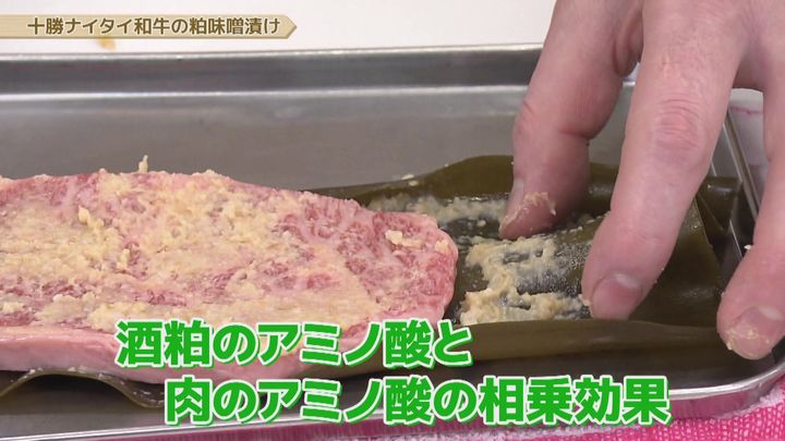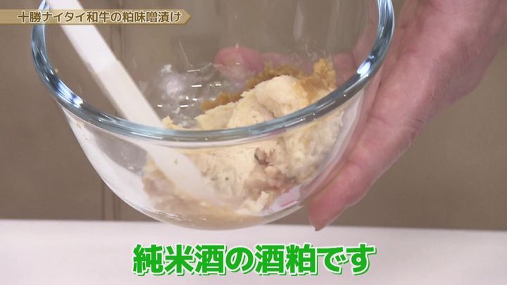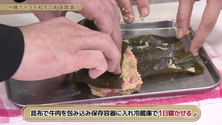 ③合わせた粕味噌をまずは少量昆布に塗る。残りを牛肉の両面に塗る