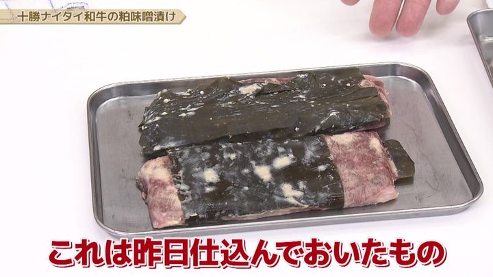 ⑥牛肉を取り出し、粕味噌をキッチンペーパーでふき取る。
