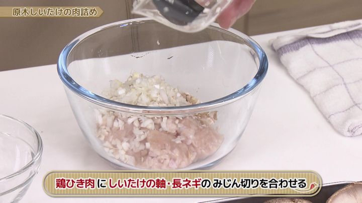 ➁*の材料とみじん切りにした原木しいたけの軸をボウルに入れ、ねばりがでるまで混ぜる