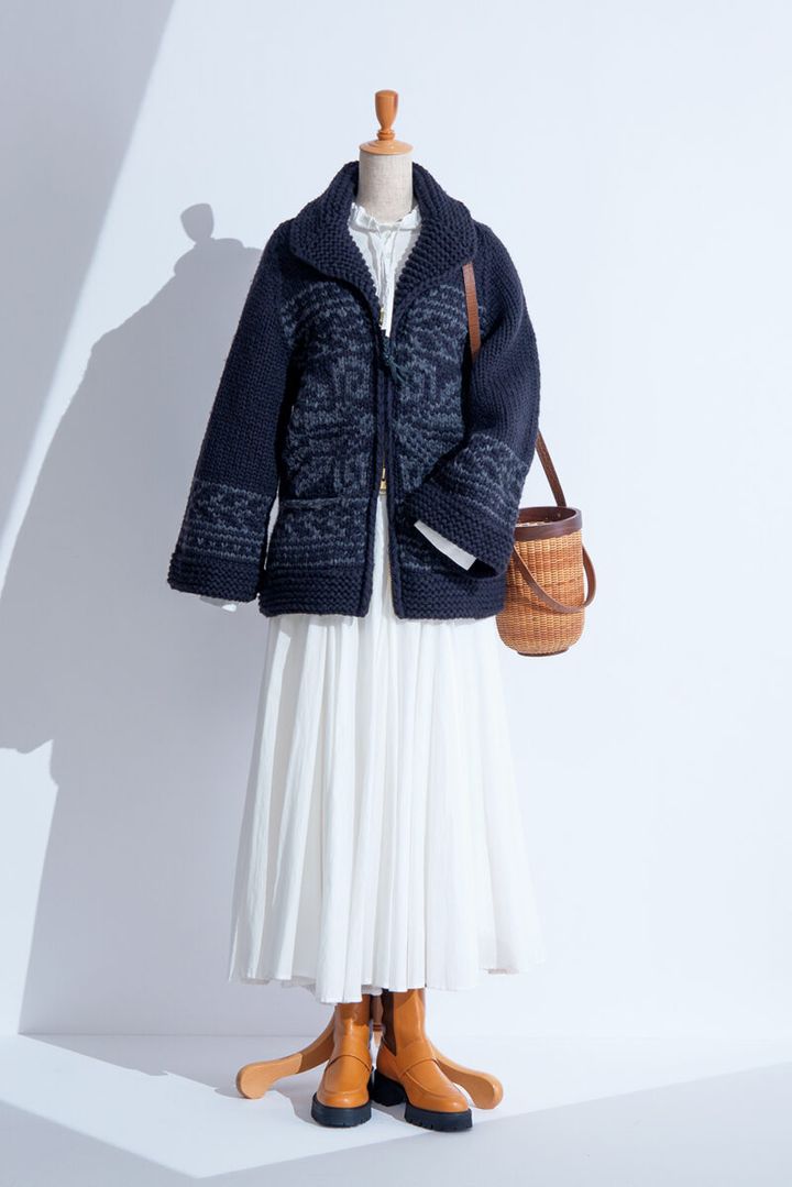 ジップアップセーター¥171,600/カナディアン セーター、バッグ¥398,000/ヌーベル•ナンタケットバスケット(ともにエディット アンド コー ドレスミー)、ブラウス¥12,980、スカート¥16,940/ともにミズイロインド(マーコート)、ブーツ¥49,500/リュニック エ モア(トーケン)